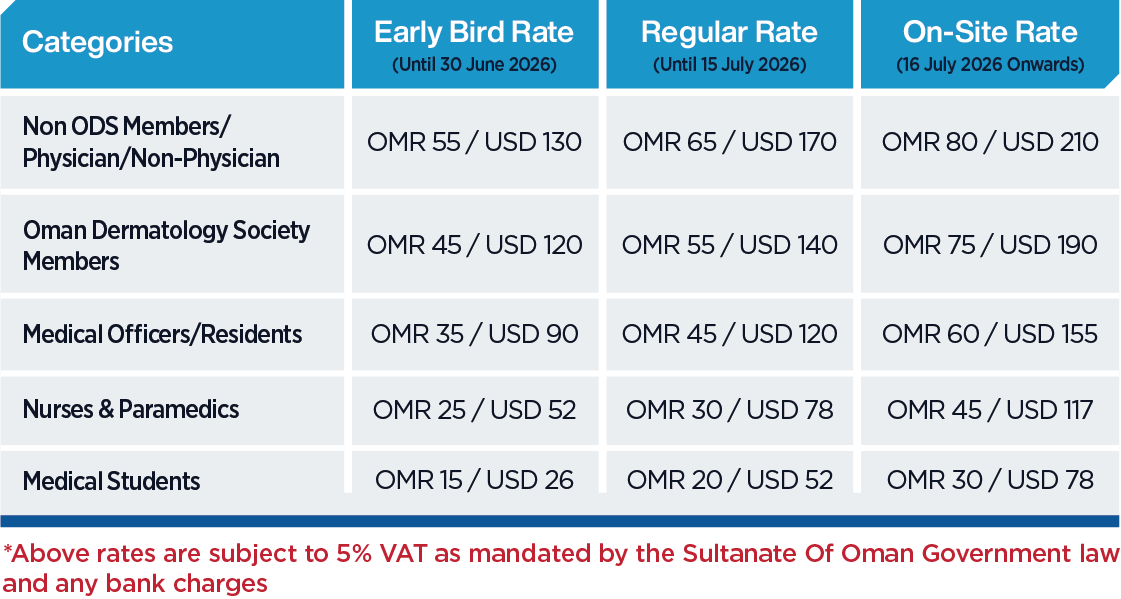 | Oman Dermatology Society Members (Work ID Proof) | OMR 60 / USD 155 | OMR 80 / USD 210 | OMR 100 / USD 260 |